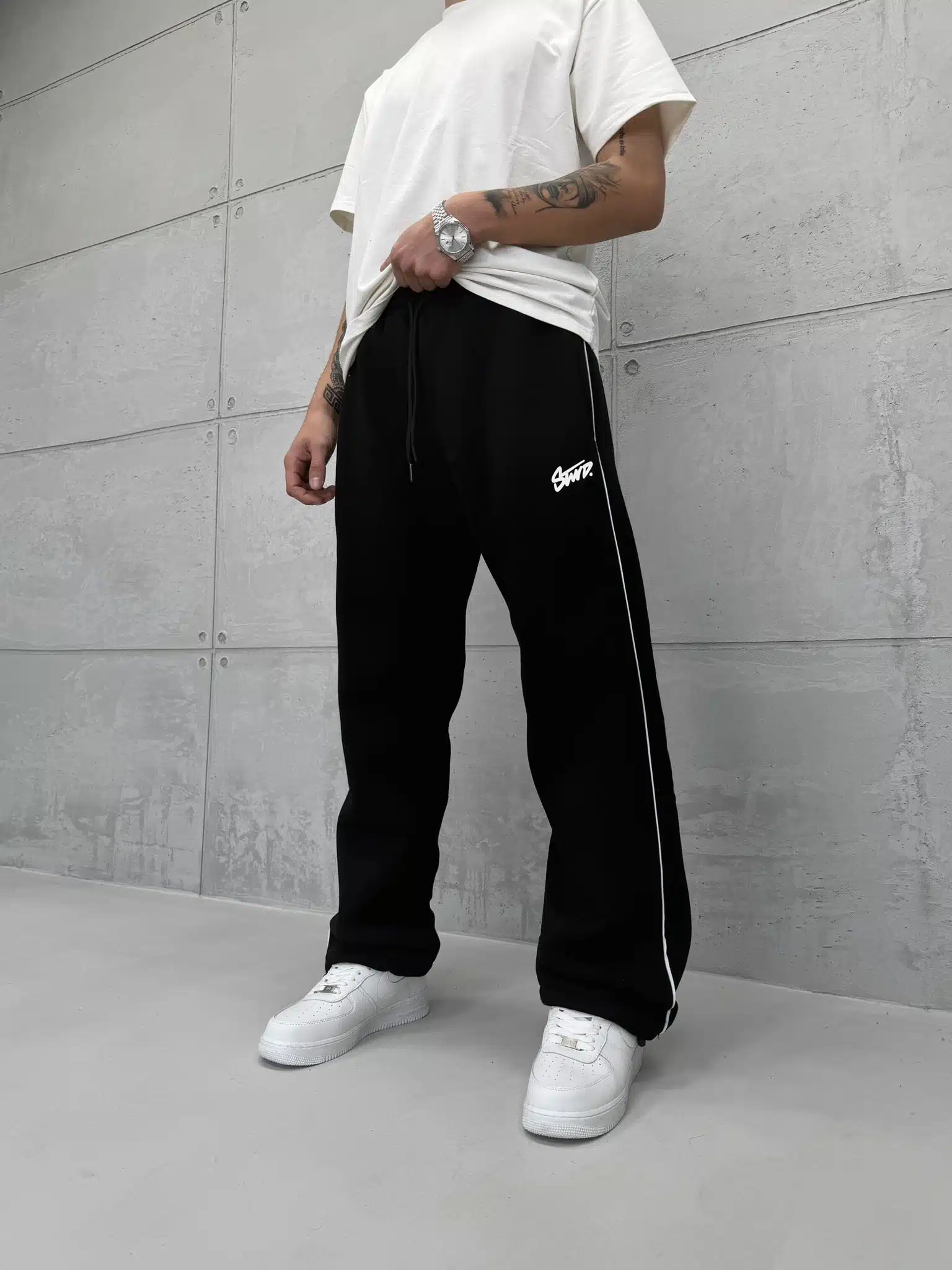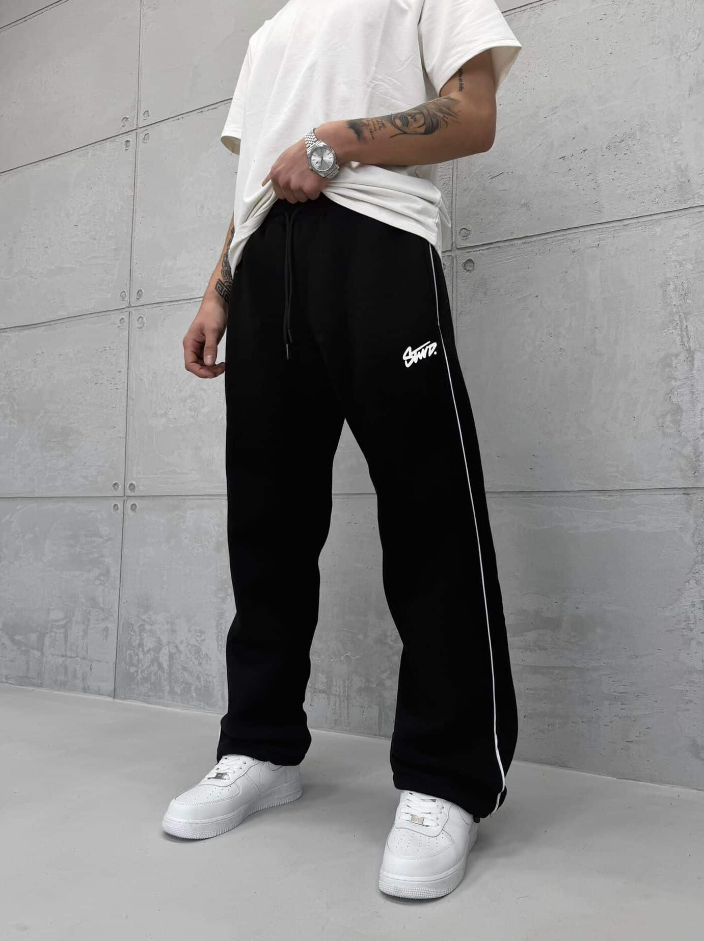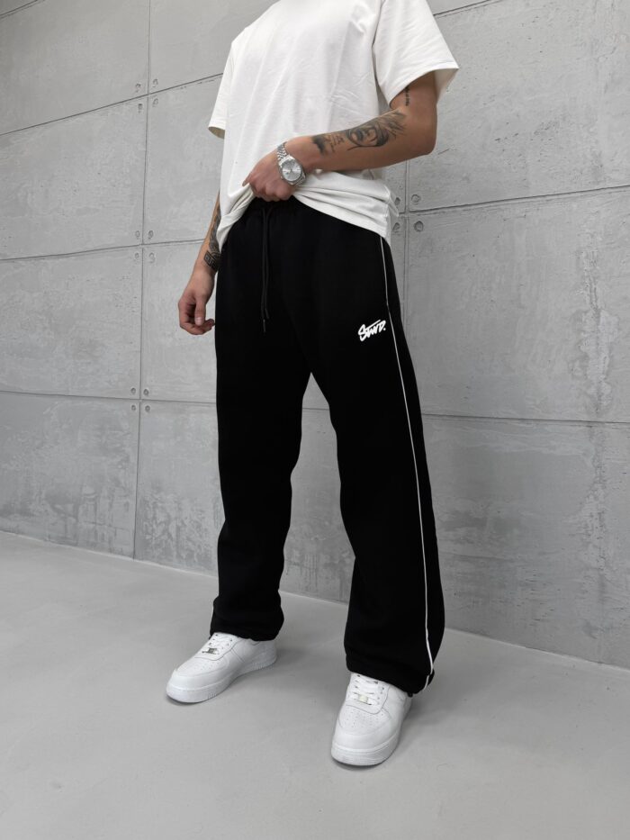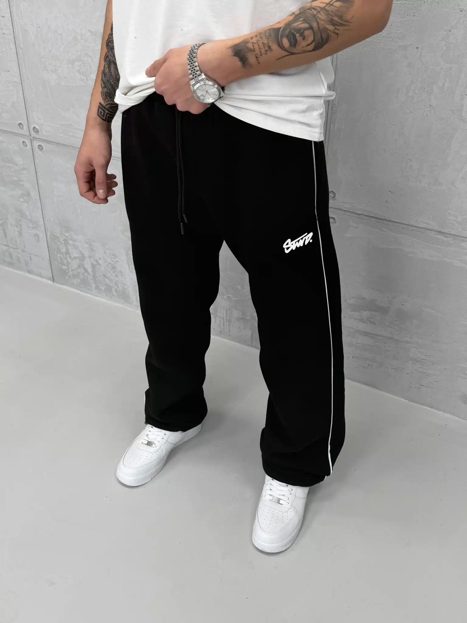 ‘SW’ Baskılı Çizgili Lastikli Stoper Paça Baggy Eşofman – Siyah
