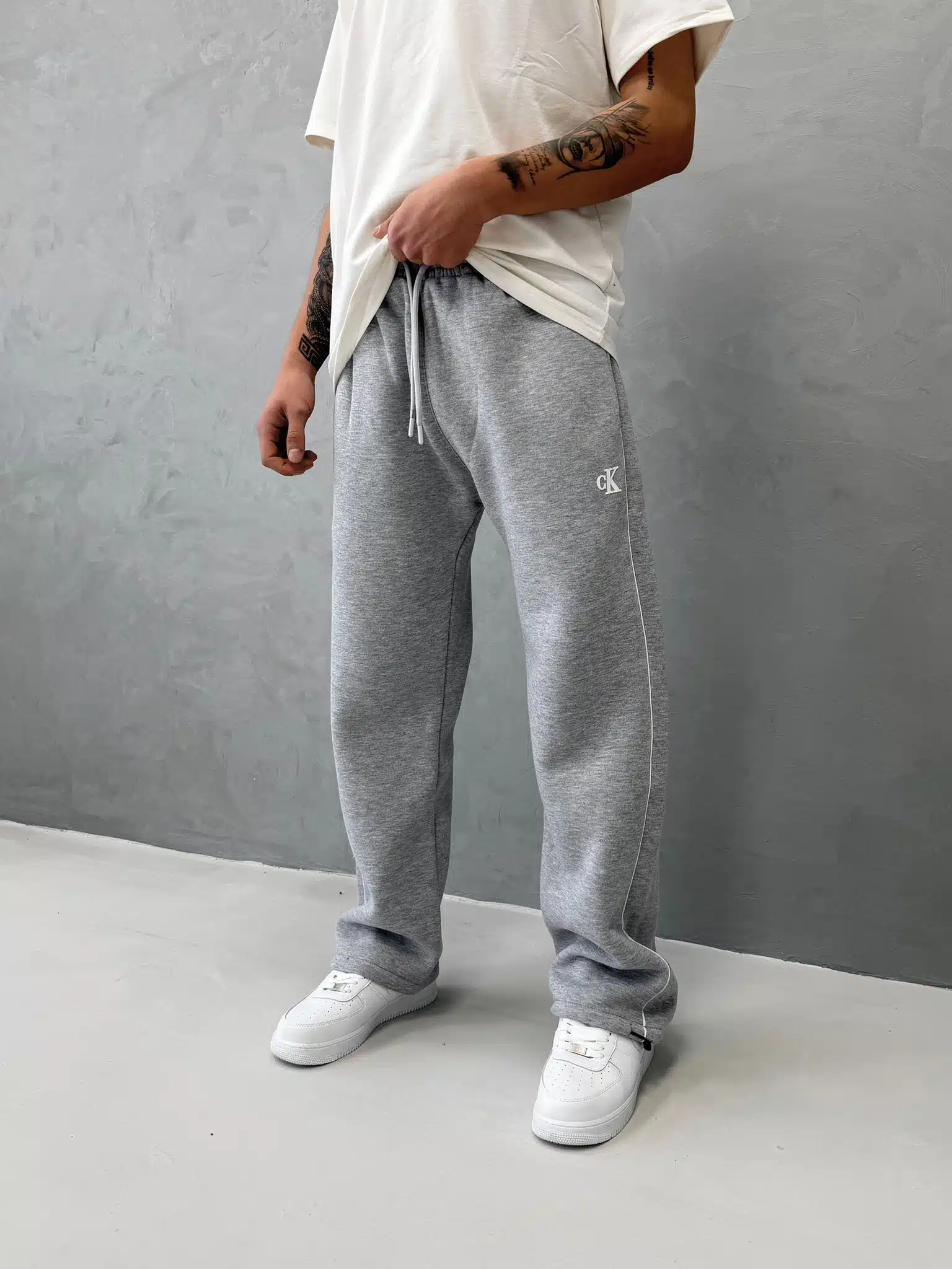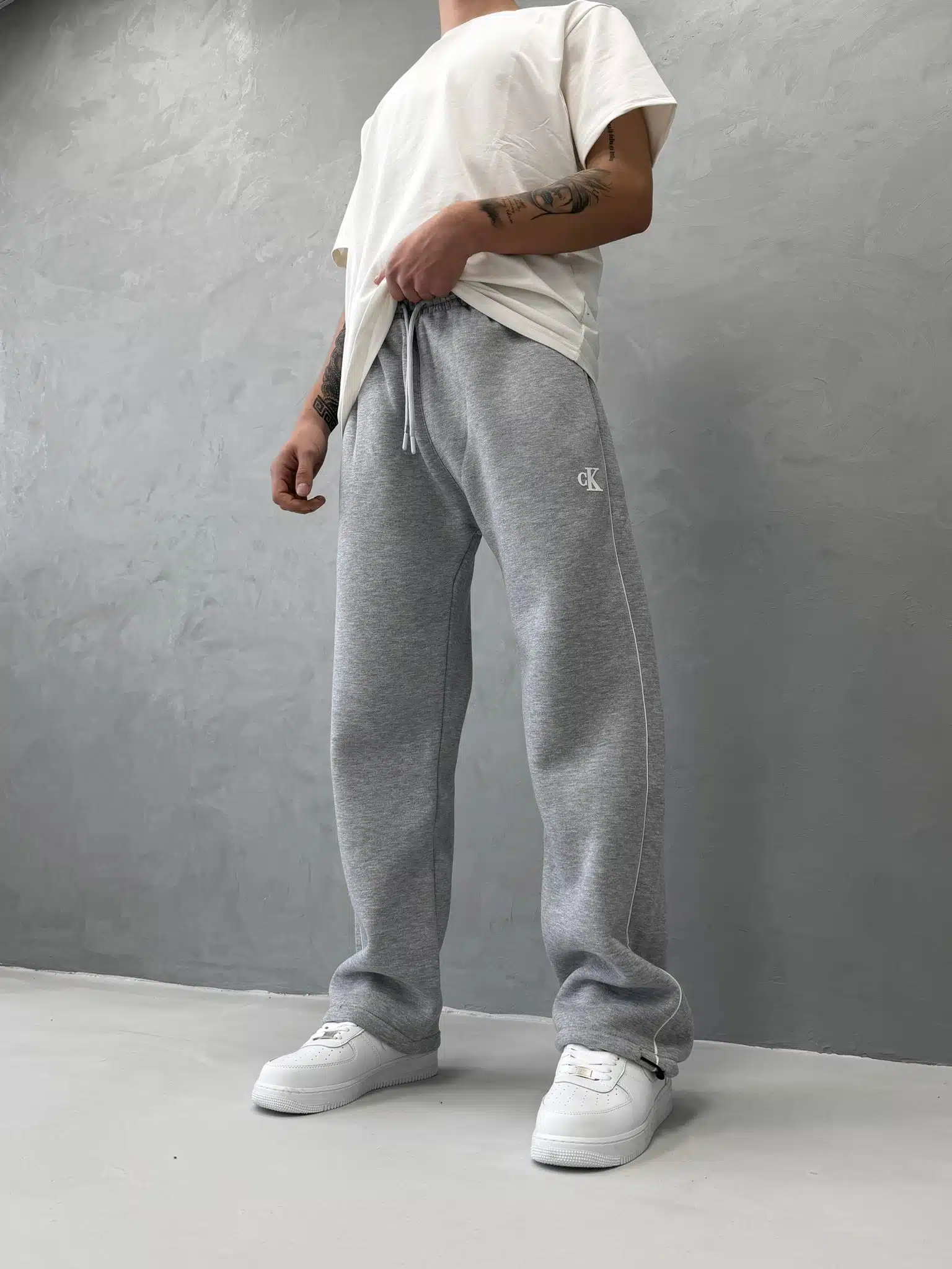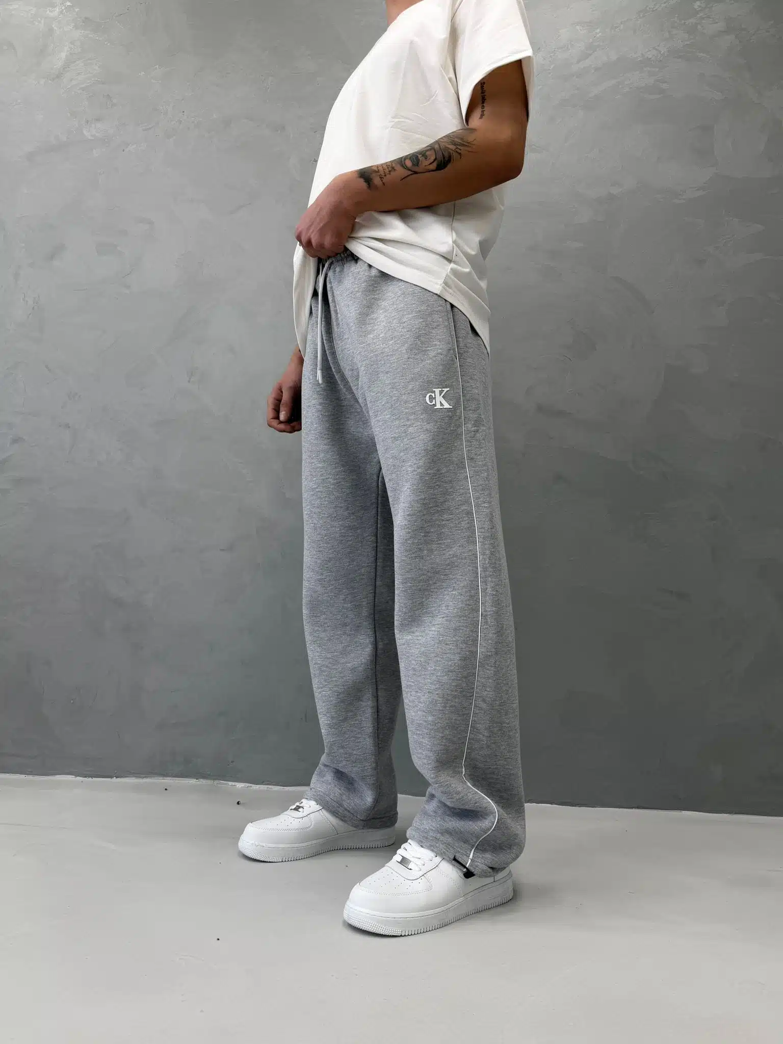 ‘CK’ Enjeksiyon Baskılı Çizgili Lastikli Stoper Paça Baggy Eşofman – Gri