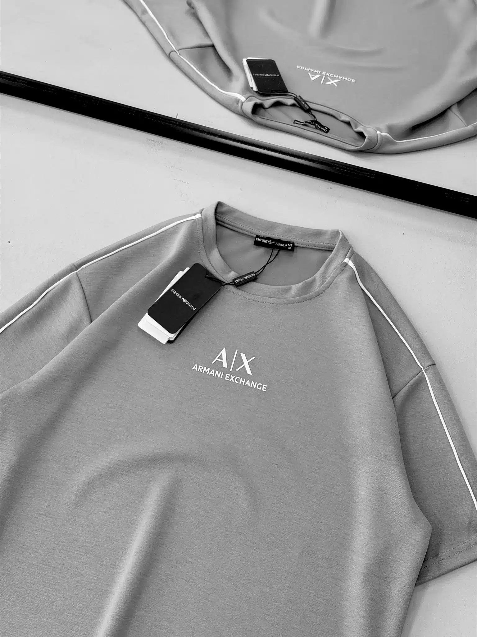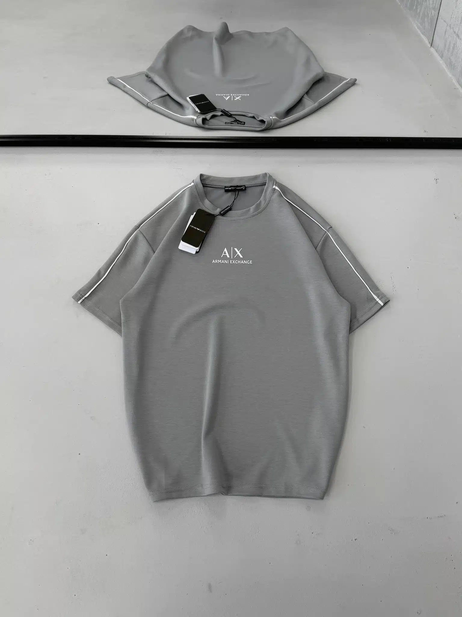 AX Enjeksiyon Baskılı Şerit Detaylı Bisiklet Yaka Tshirt – Gri