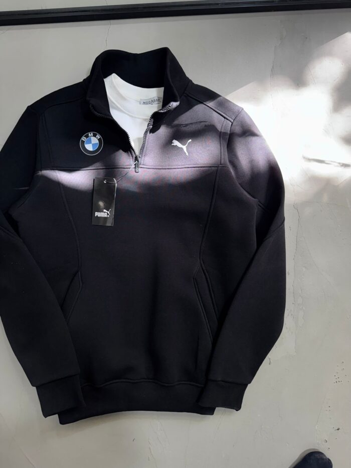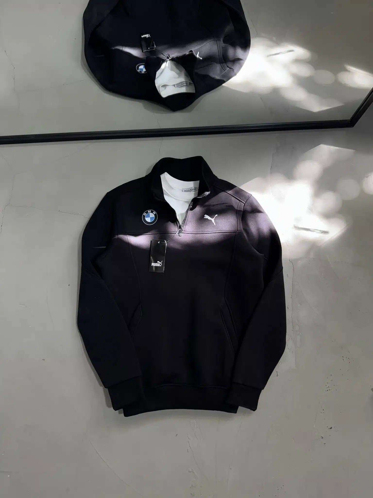 PM Reflektör Baskılı Üç İplik Yarım Fermuarlı Sweatshirt – Siyah