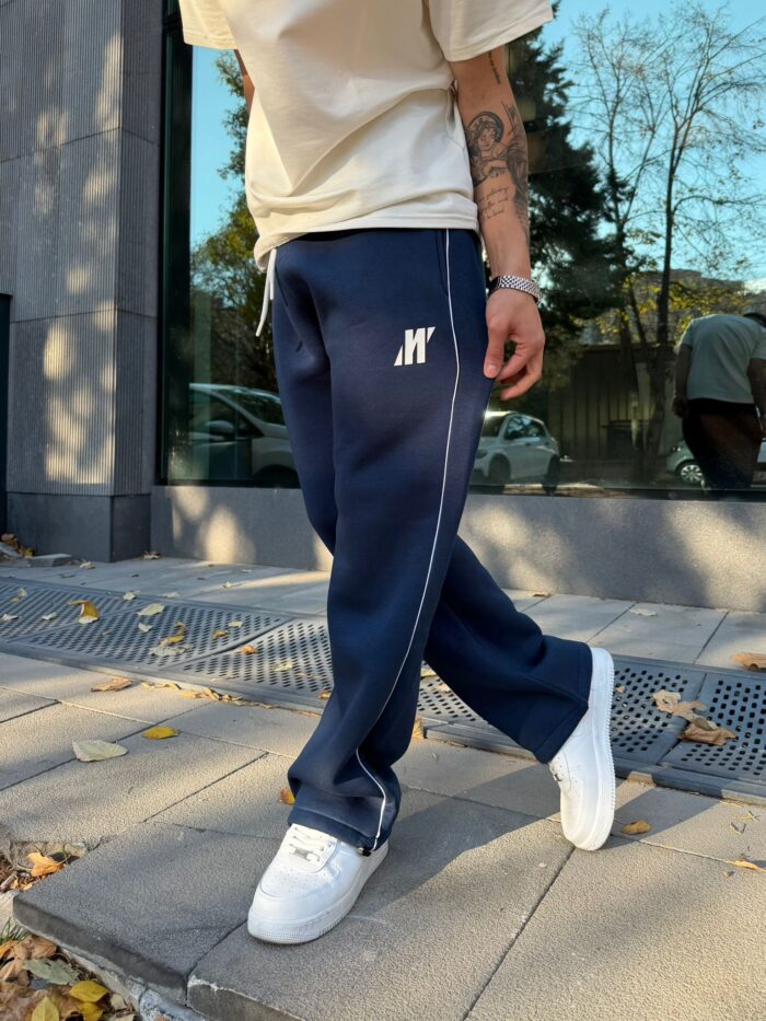 ‘M’ Enjeksiyon Baskılı Çizgili Lastikli Stoper Paça Baggy Eşofman – İndigo