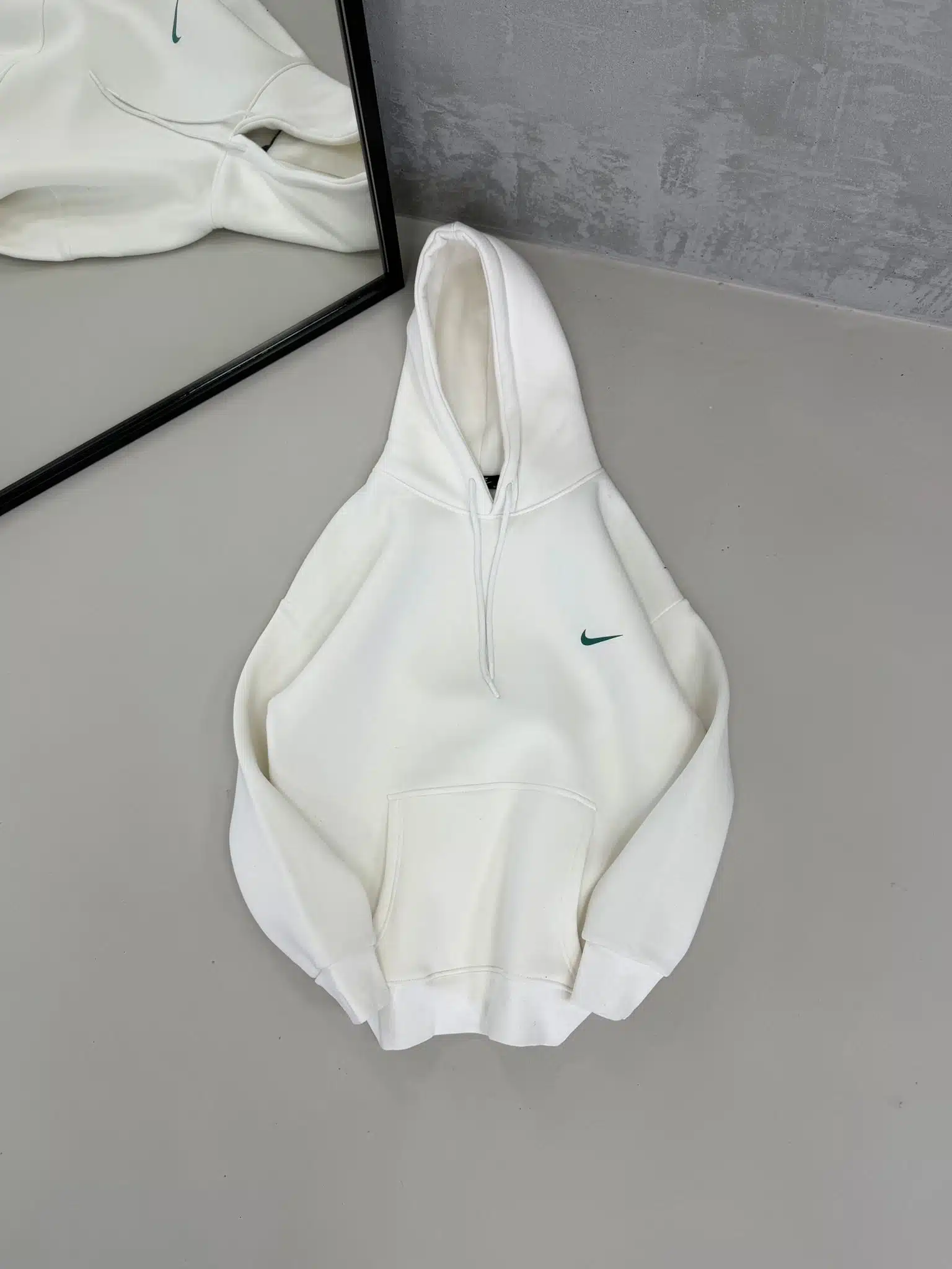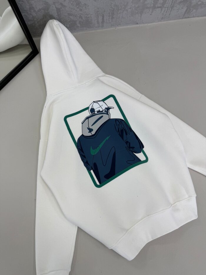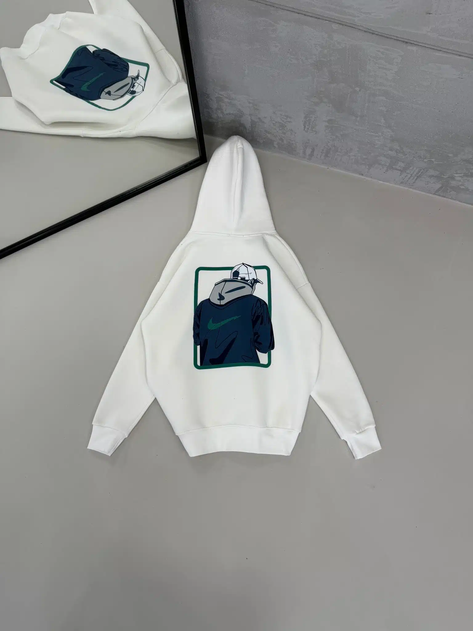 NK Büyük Kabartma Sırt Baskılı Kapşonlu Üç İplik Sweatshirt – Beyaz