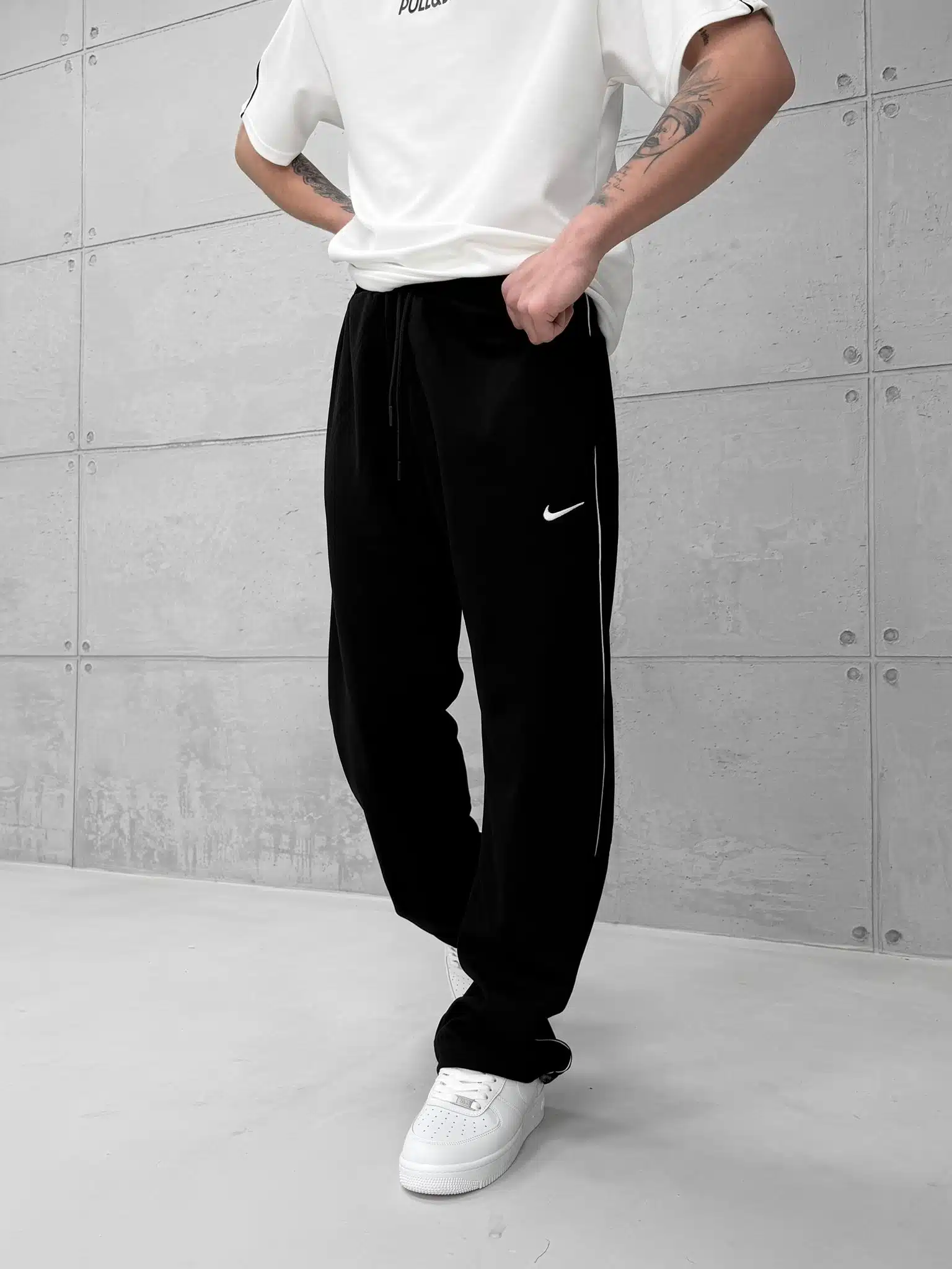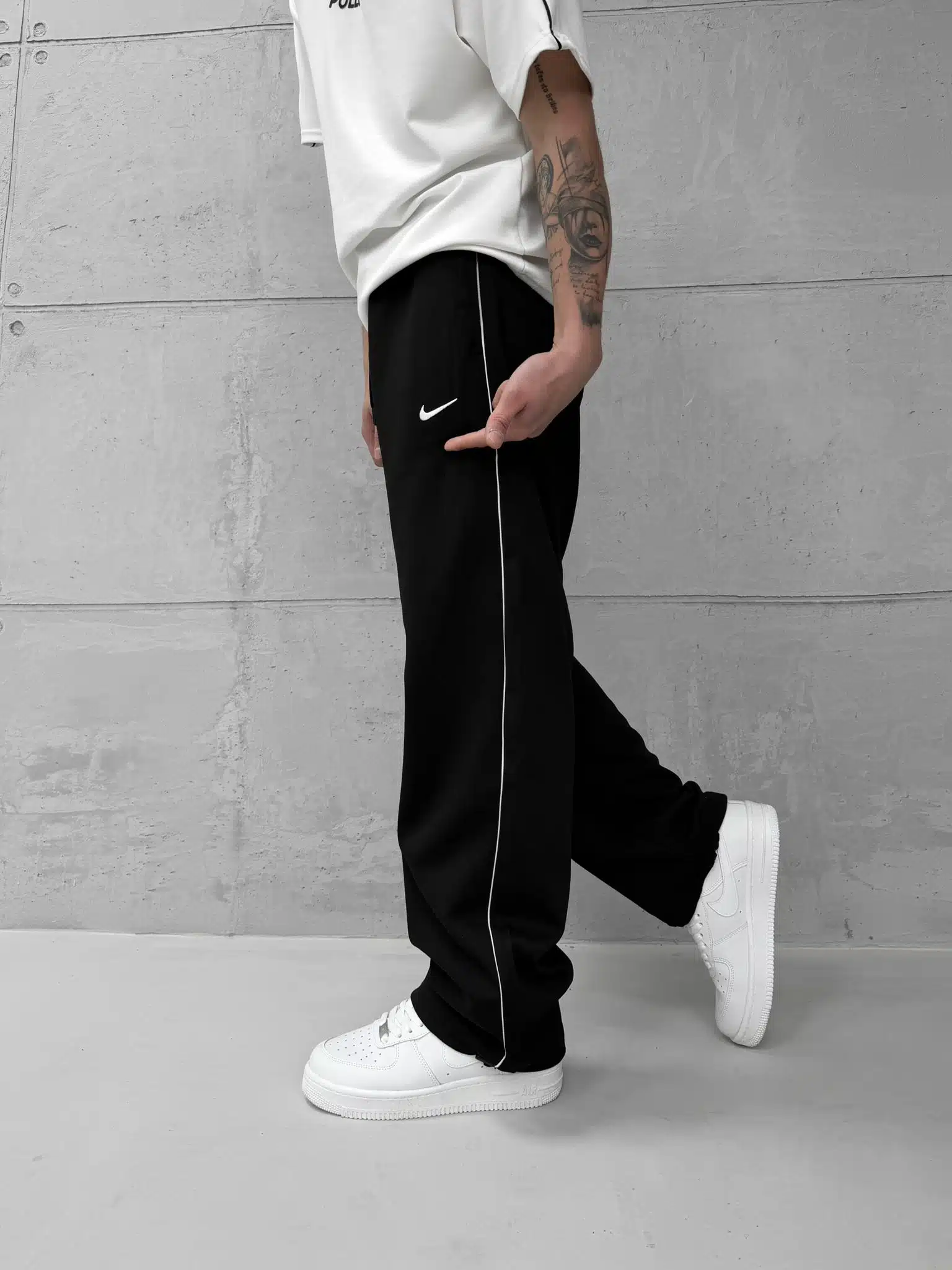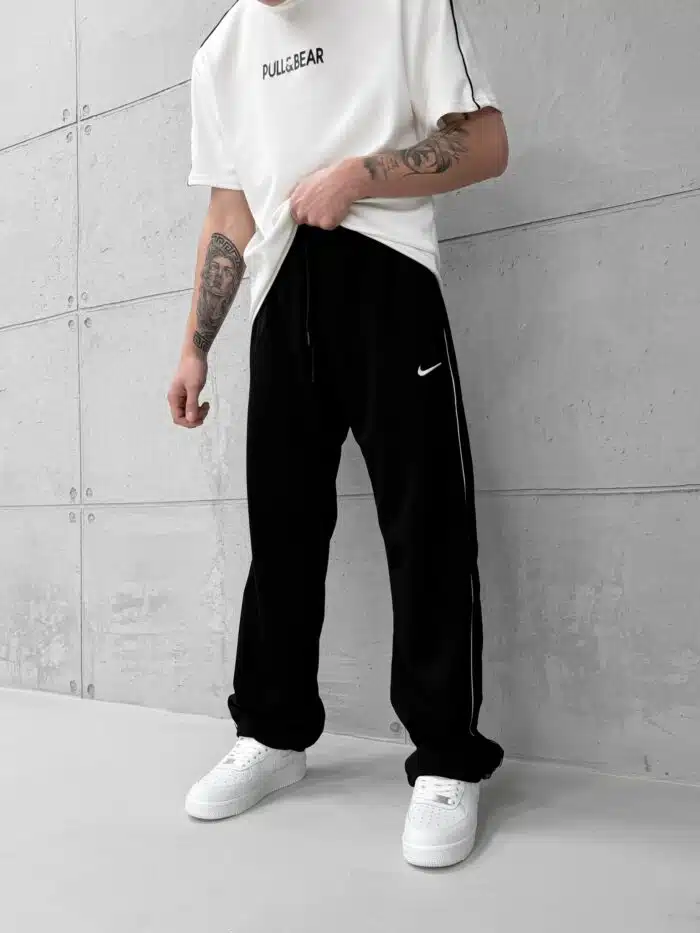 ‘NK’ Nakışlı Şeritli Lastikli Stoper Paça Baggy Eşofman -Siyah
