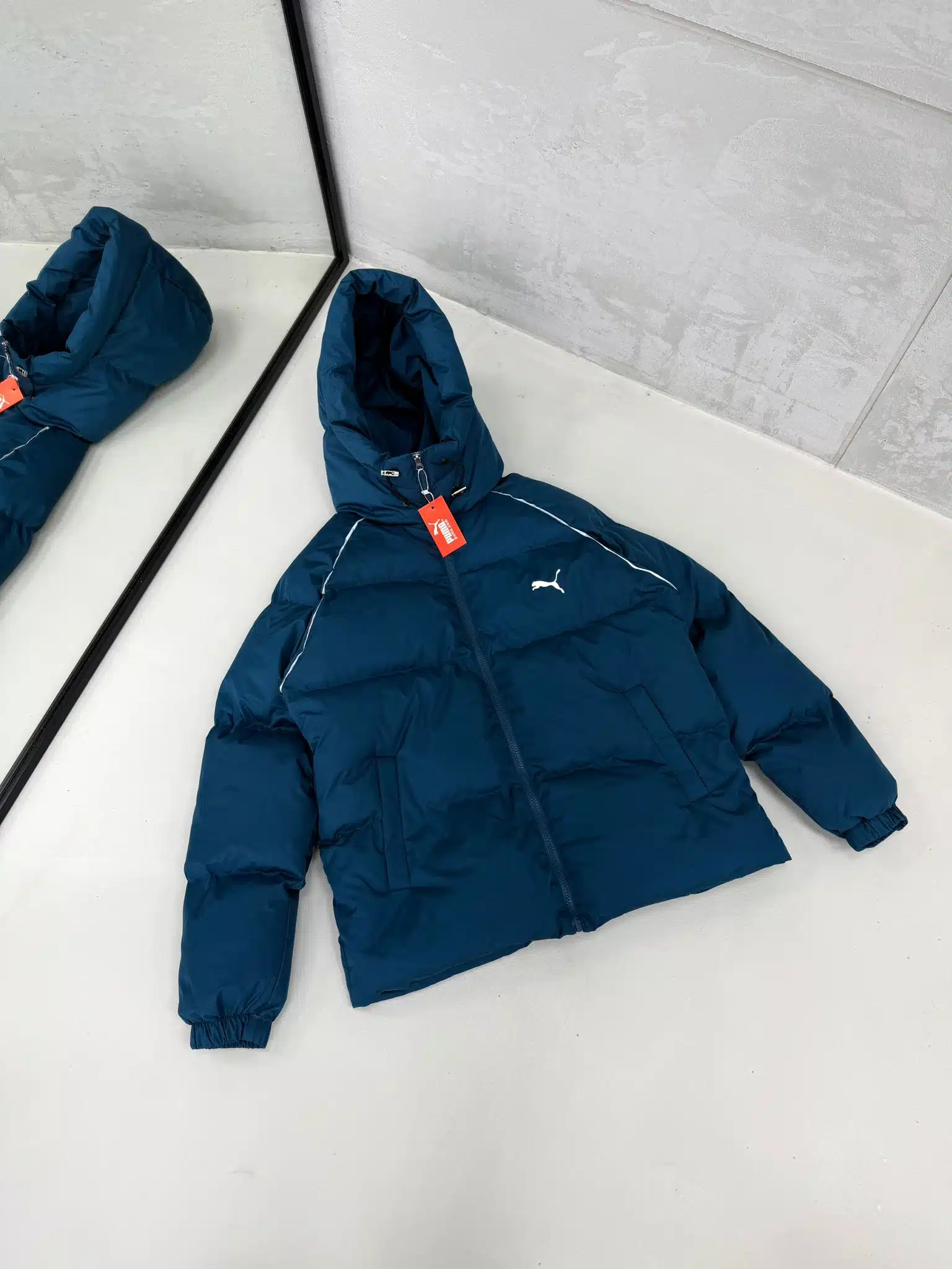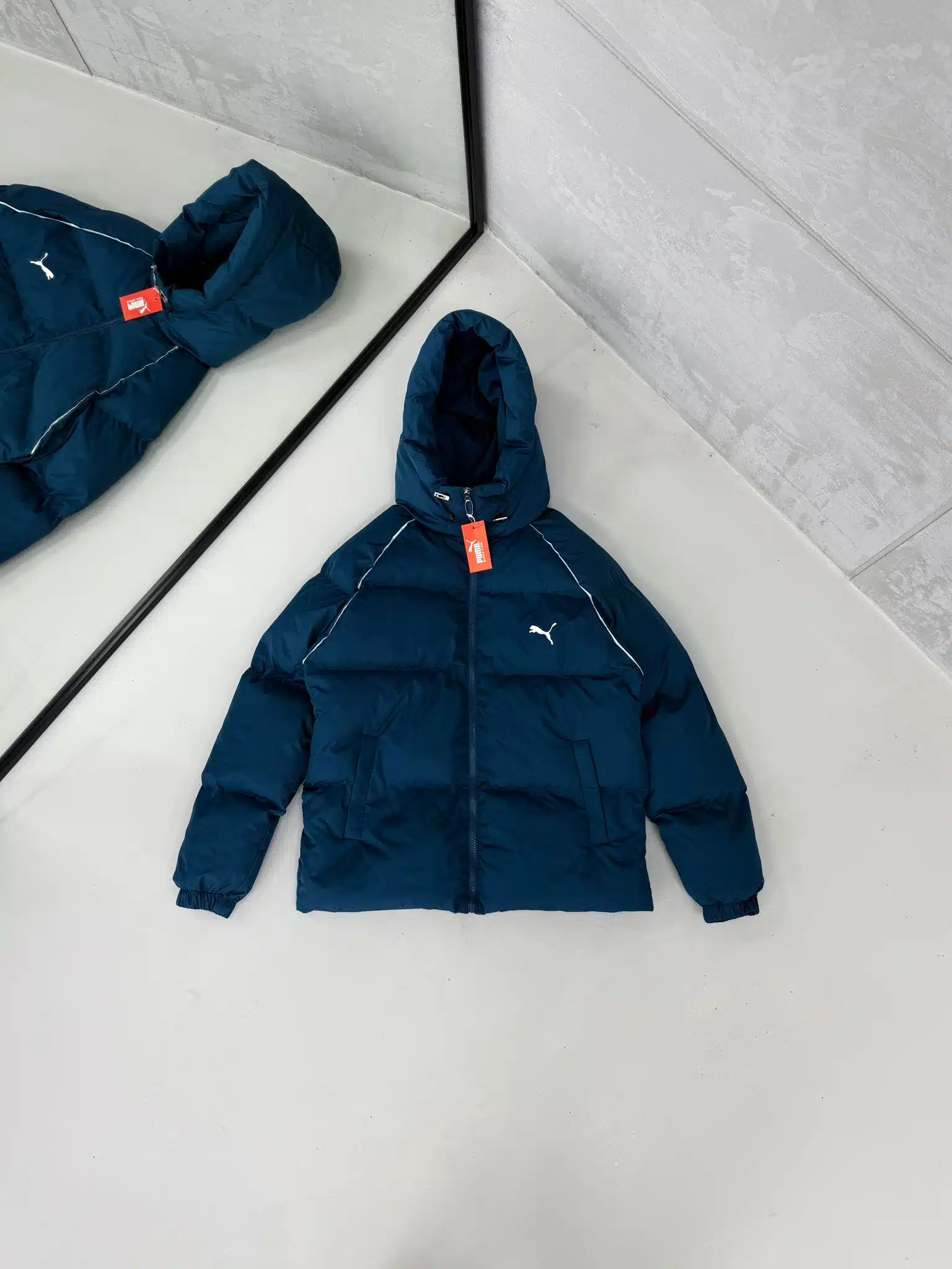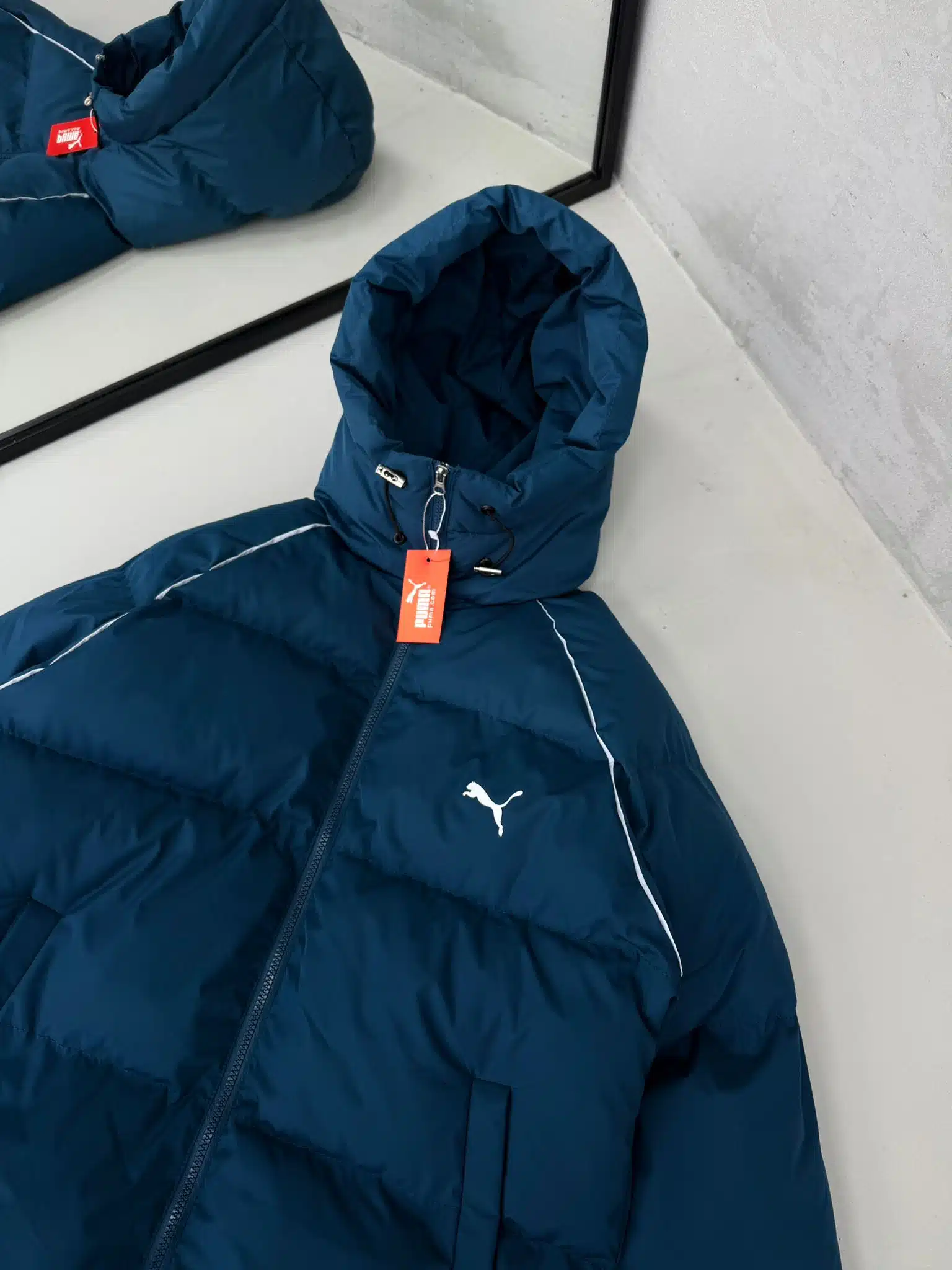 PM Enjeksiyon Baskı Kapşonlu Şişme Mont – İndigo