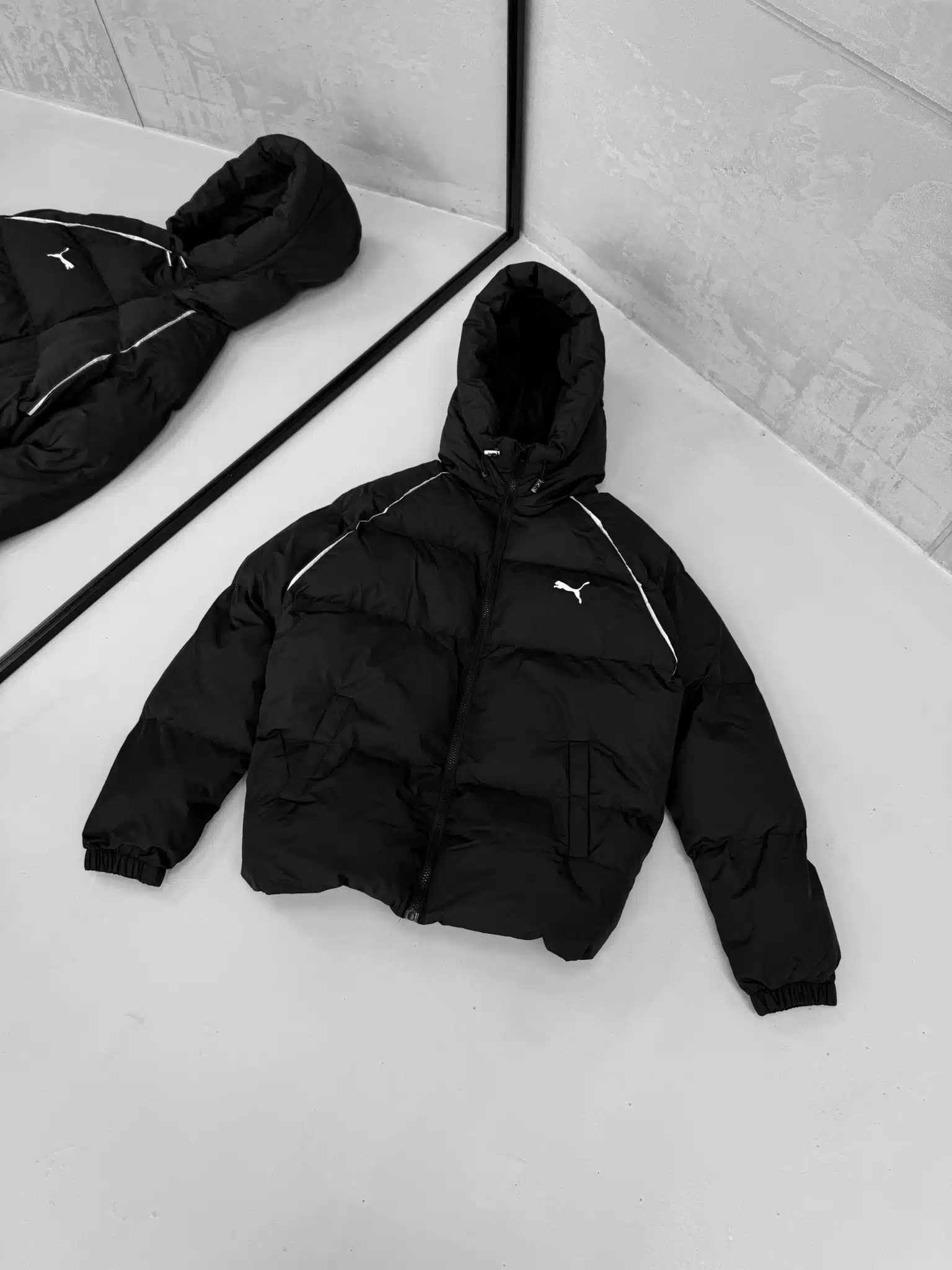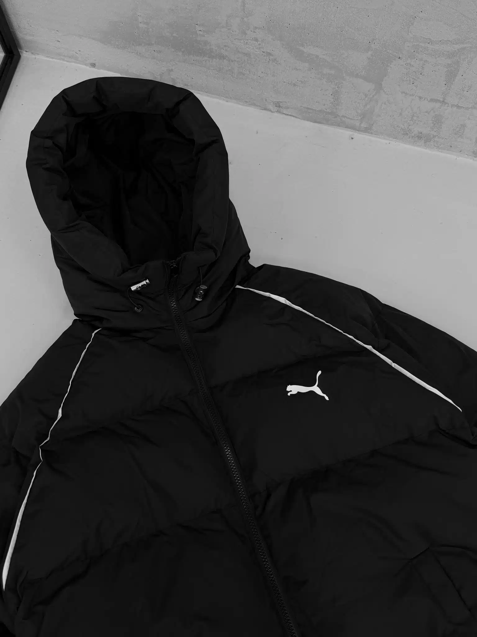 PM Enjeksiyon Baskı Kapşonlu Şişme Mont – Siyah