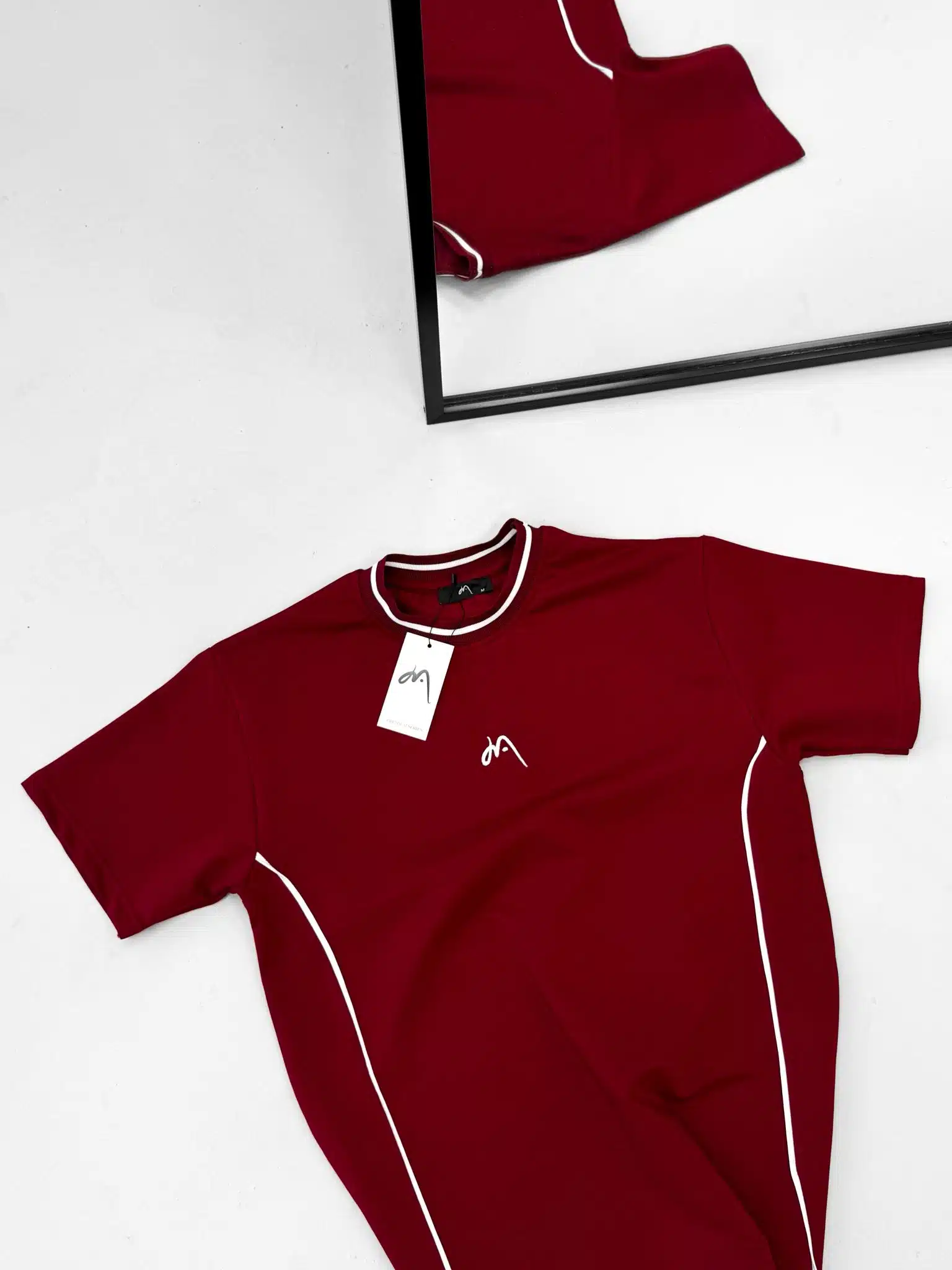 Premium İmzalı Seri Çift Şeritli Nakış Detaylı Bisiklet Yaka Tshirt -Bordo
