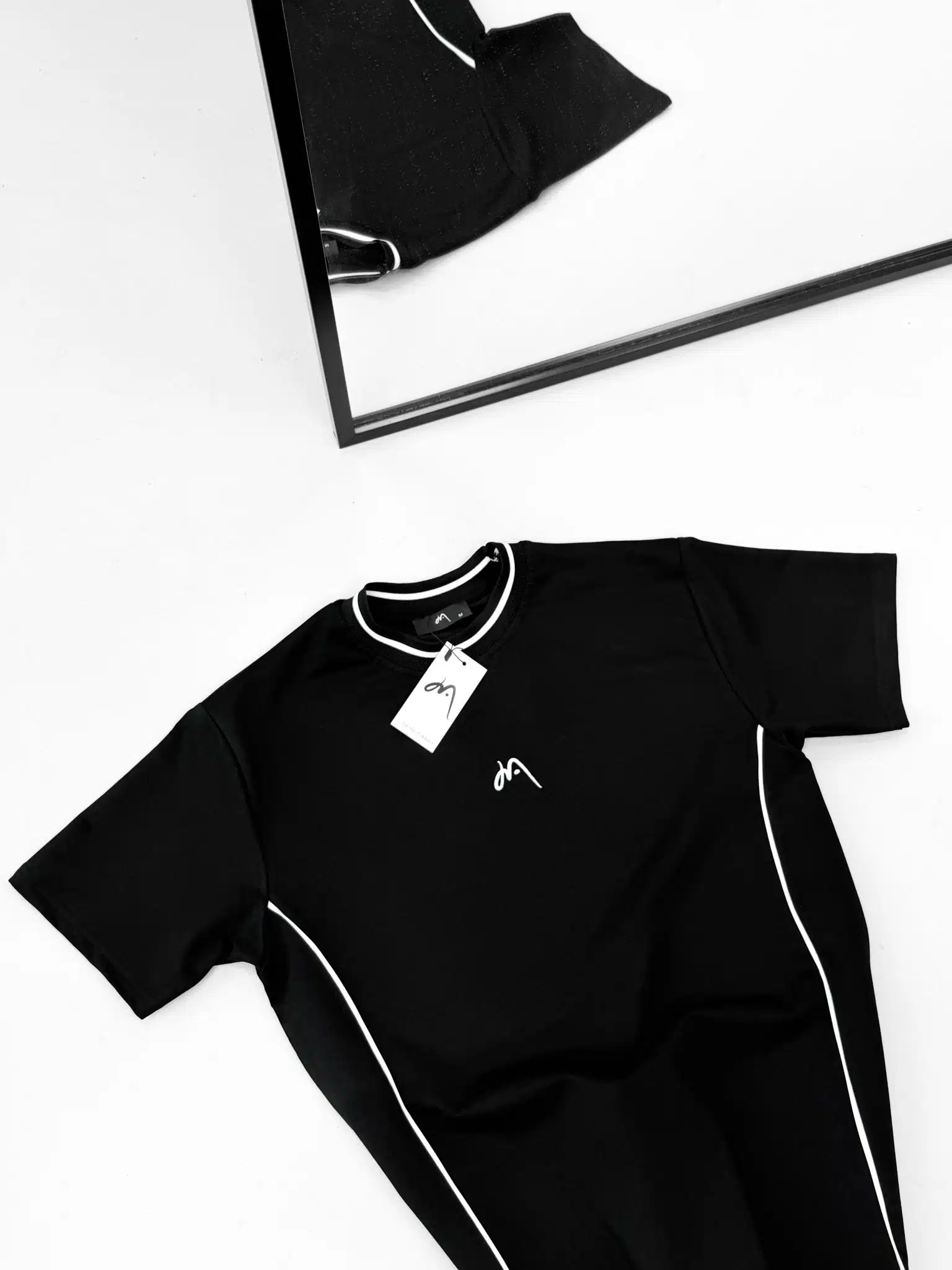 Premium İmzalı Seri Çift Şeritli Nakış Detaylı Bisiklet Yaka Tshirt -Siyah
