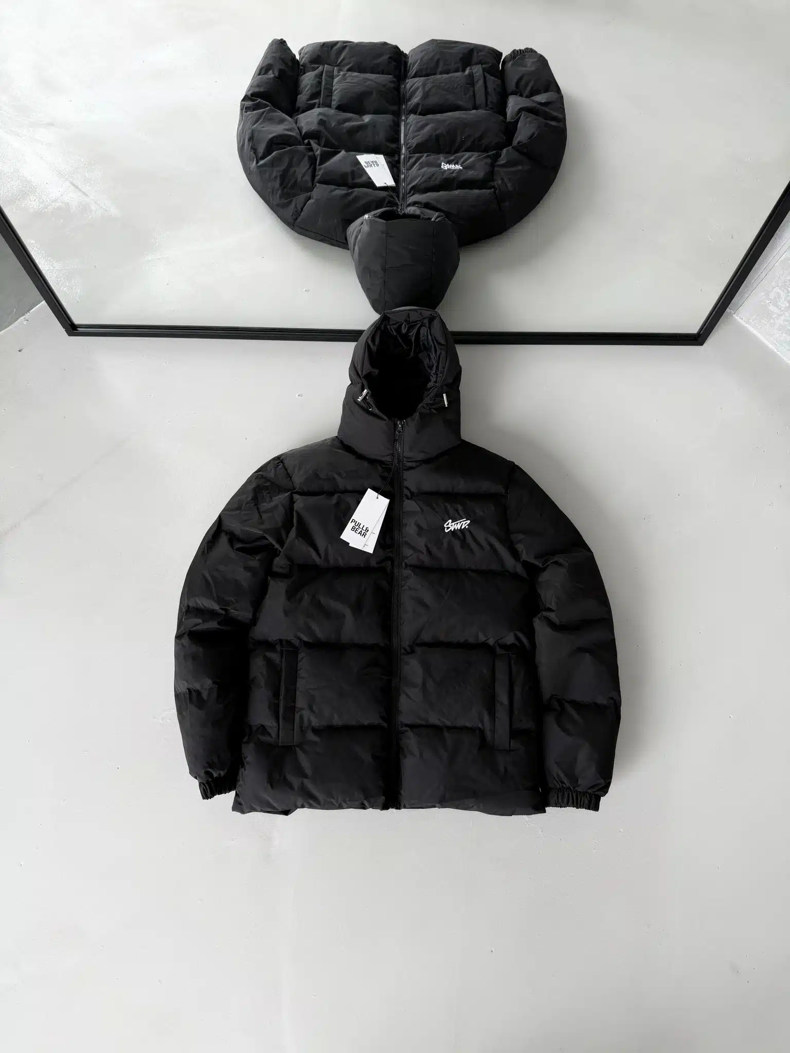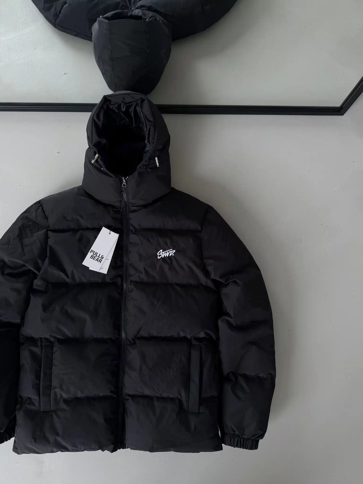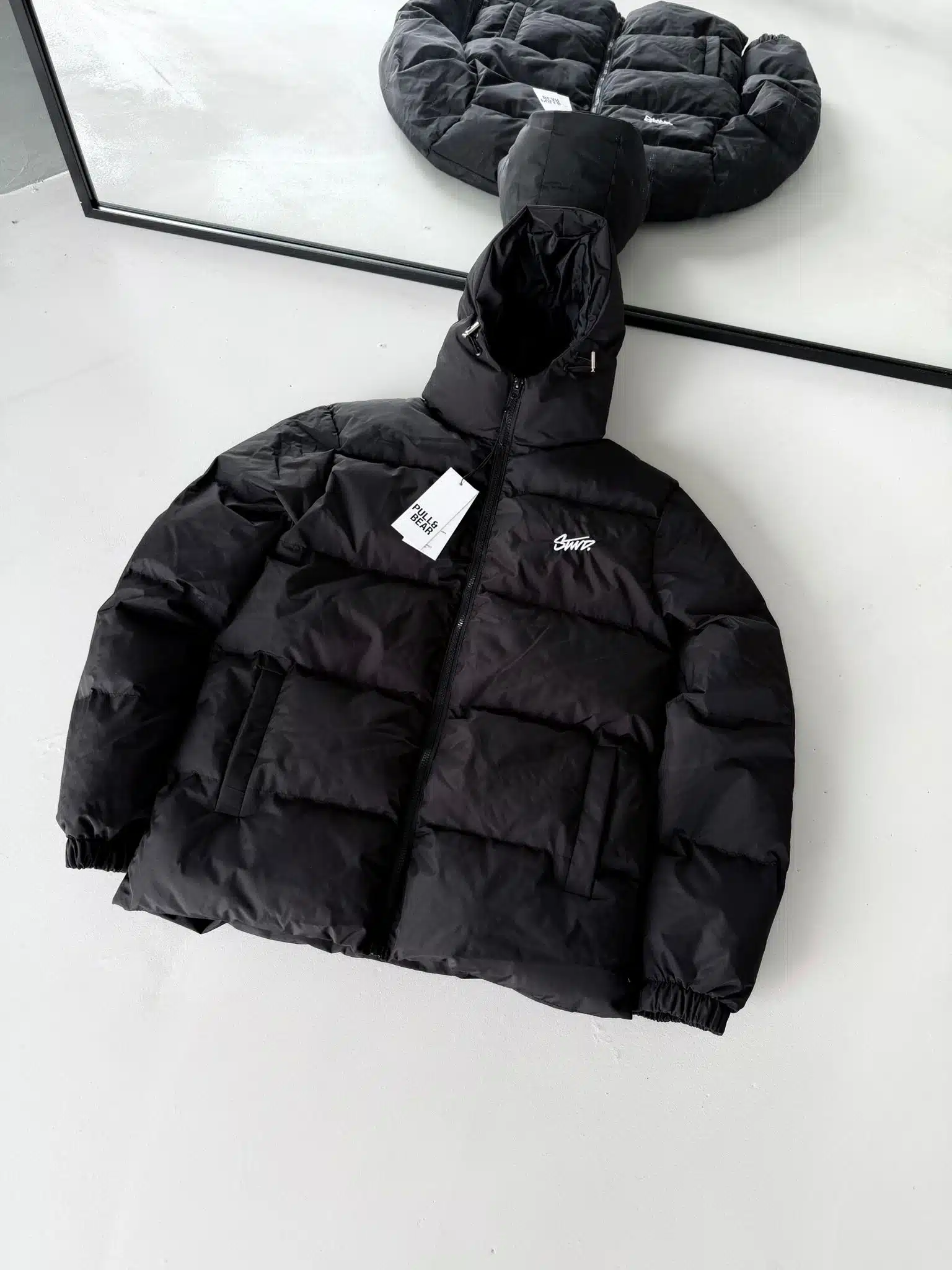 Kabartma tonaton aksesuar detaylı oversize deri şişme mont, su geçirmez özelliği ile karda ve yağmurda