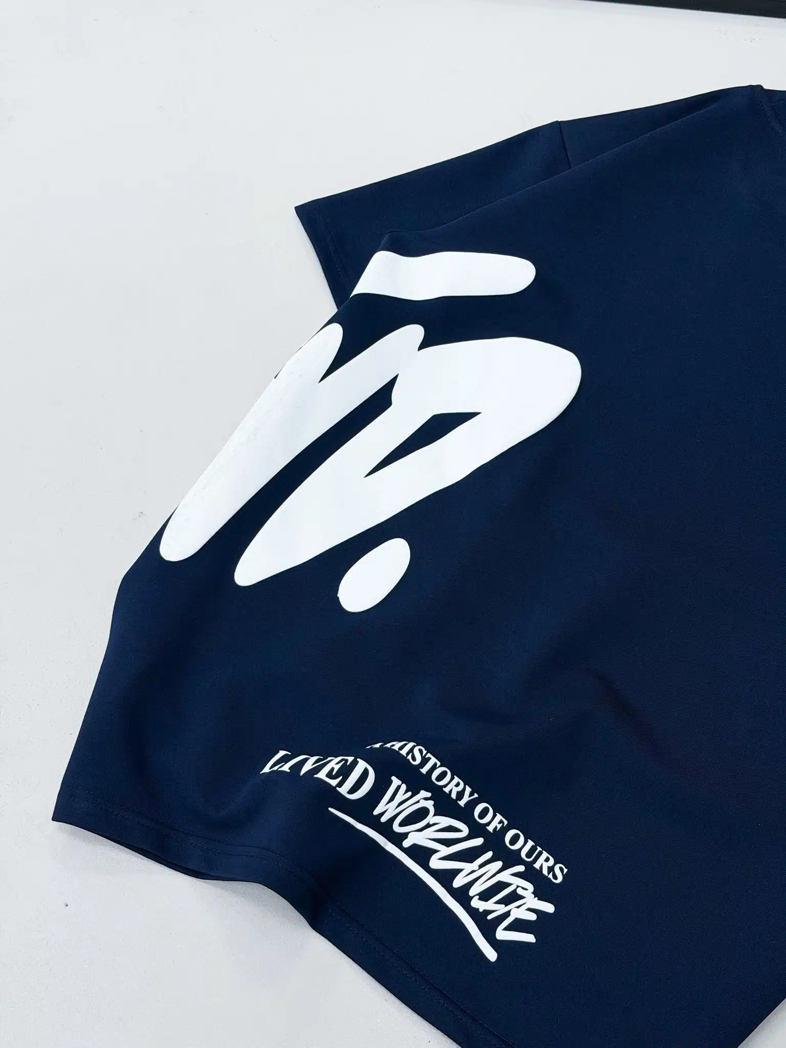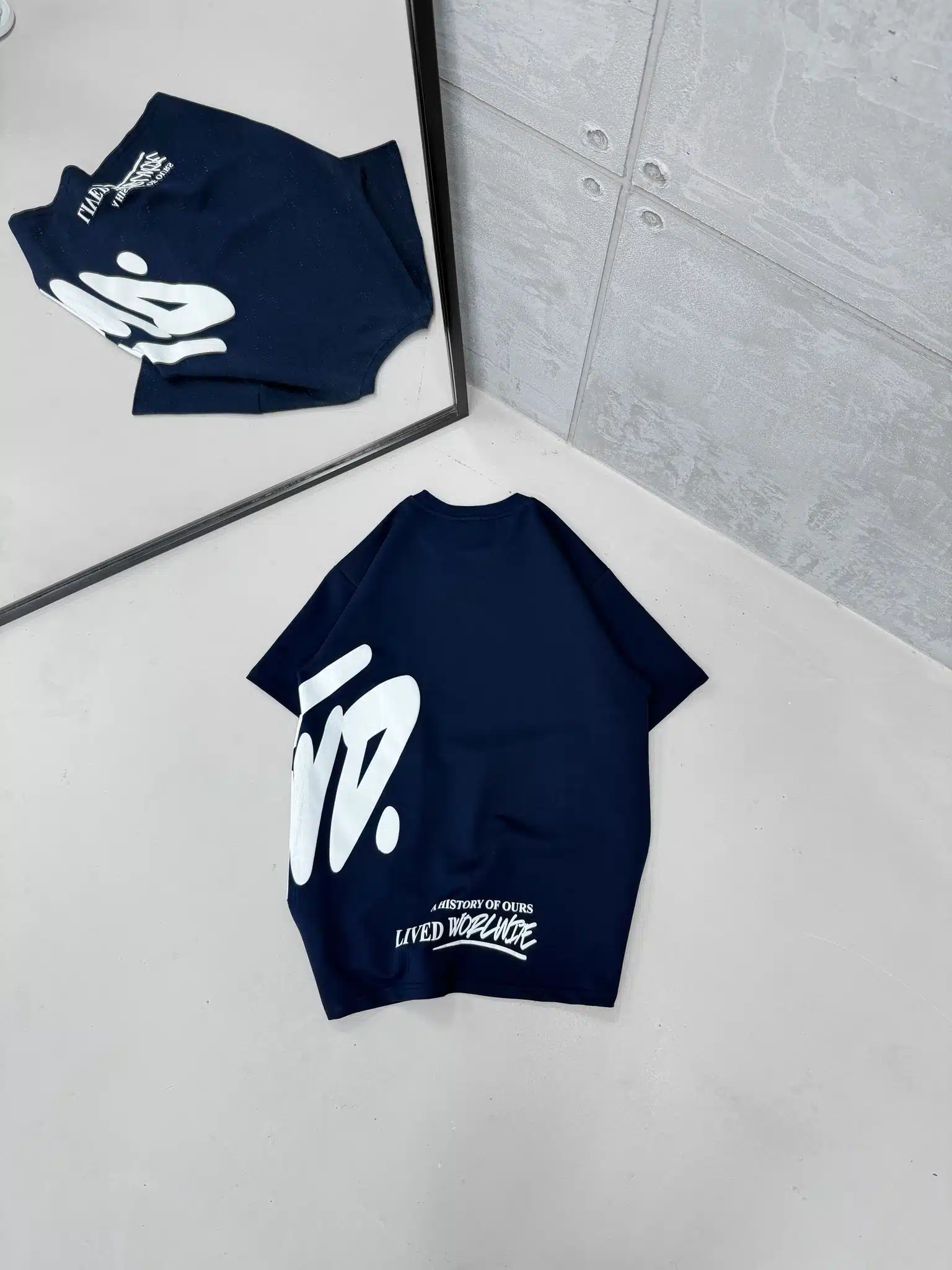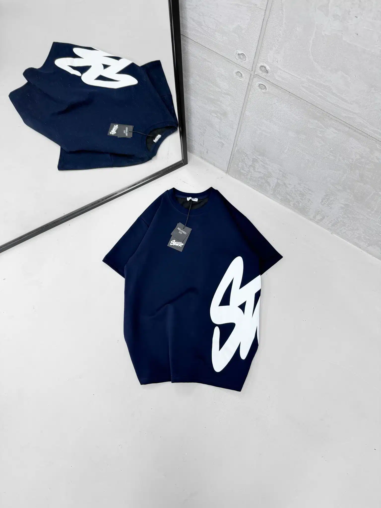 ST Yan Kabartma Baskılı Bisiklet Yaka Tshirt -Lacivert