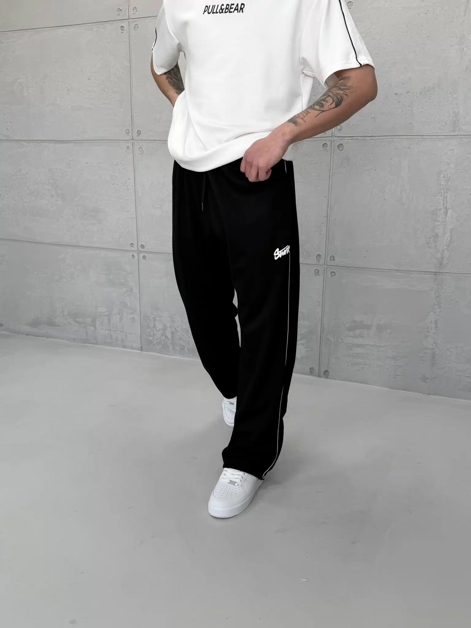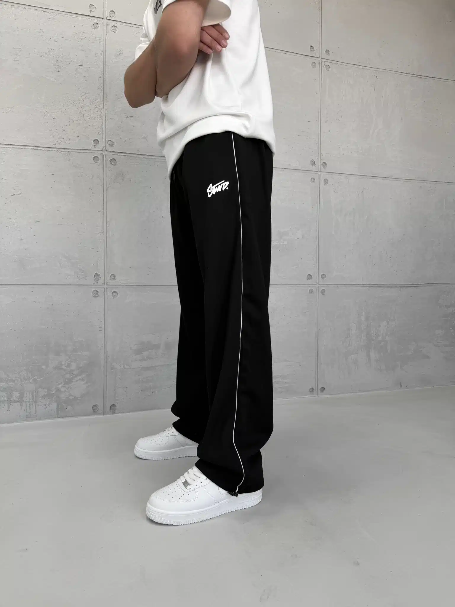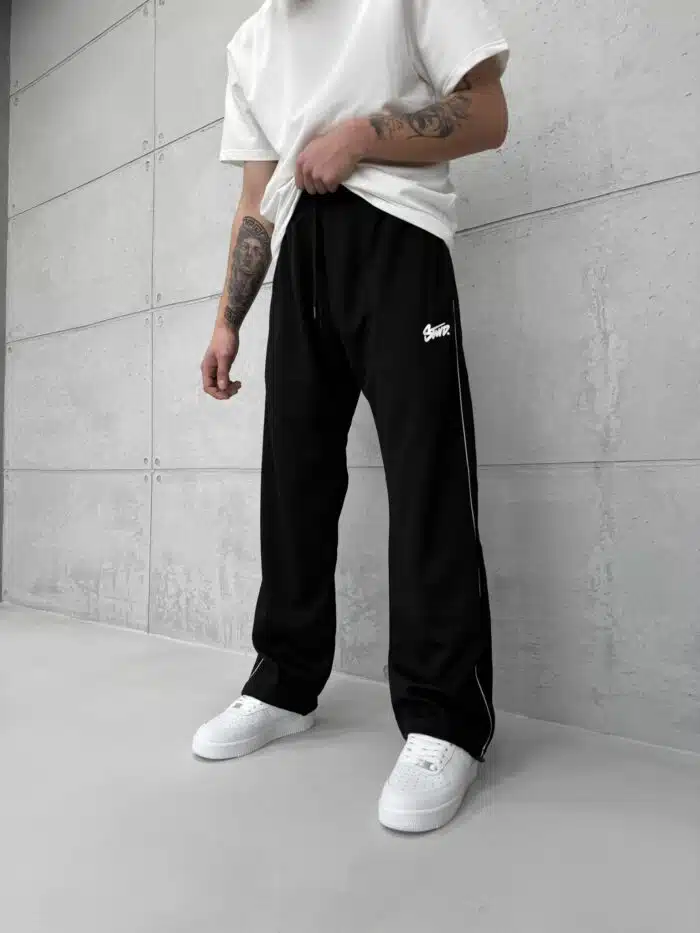 ‘SW’ Baskılı Şeritli Lastikli Stoper Paça Baggy Eşofman – Siyah