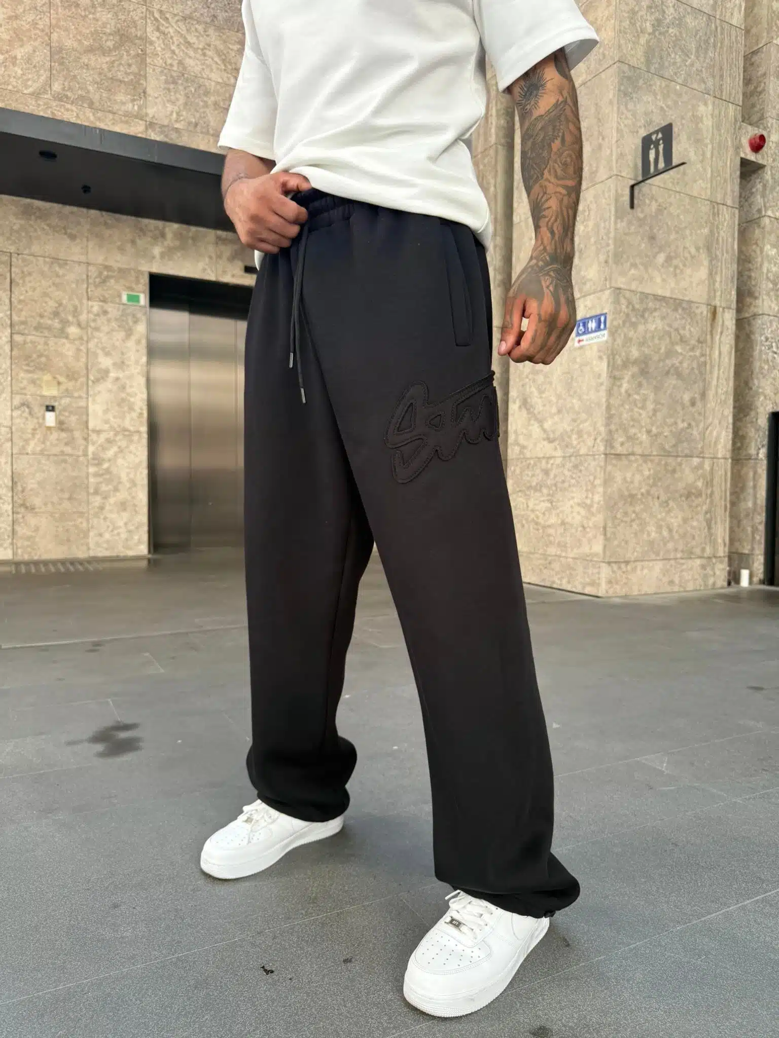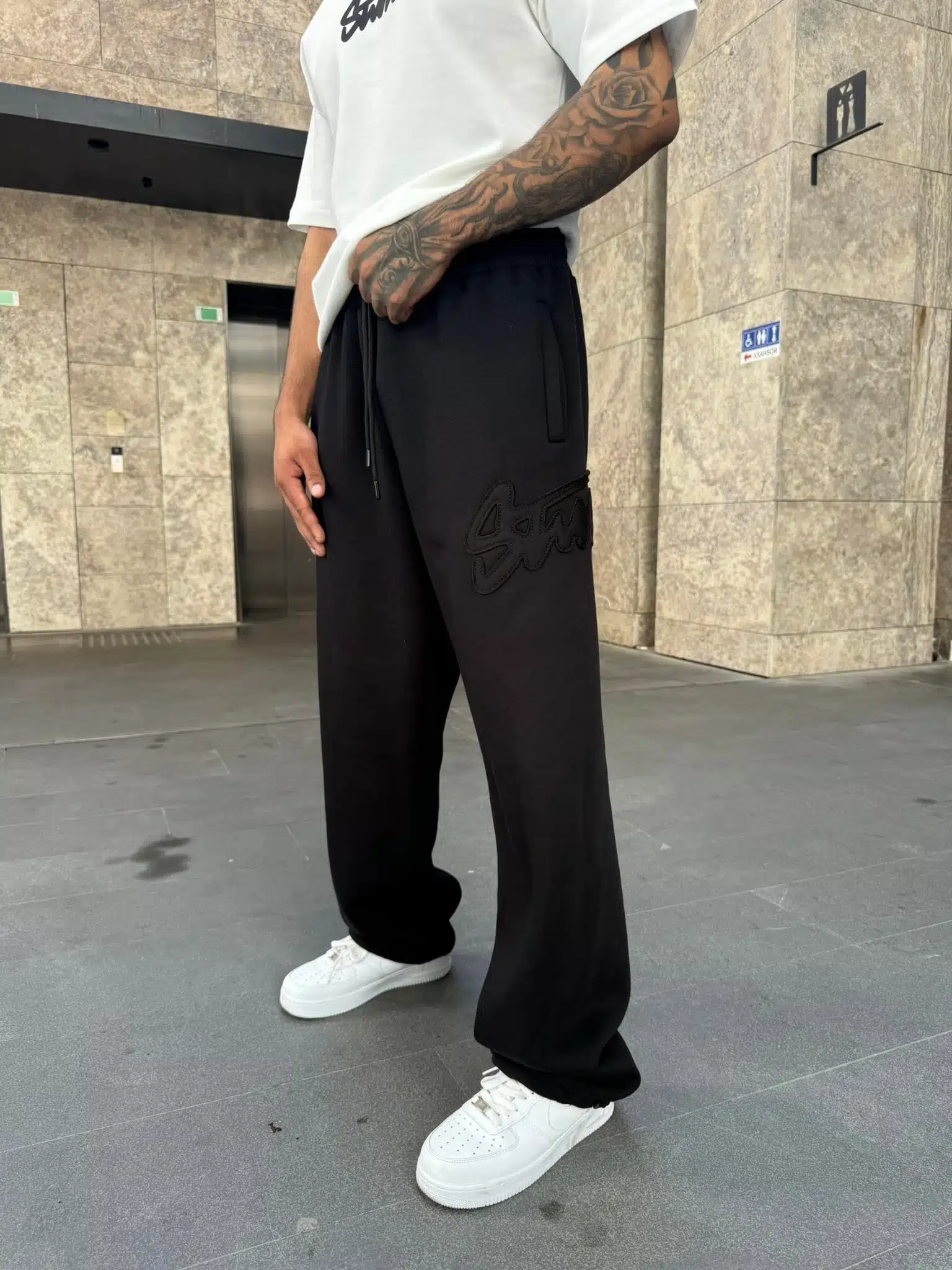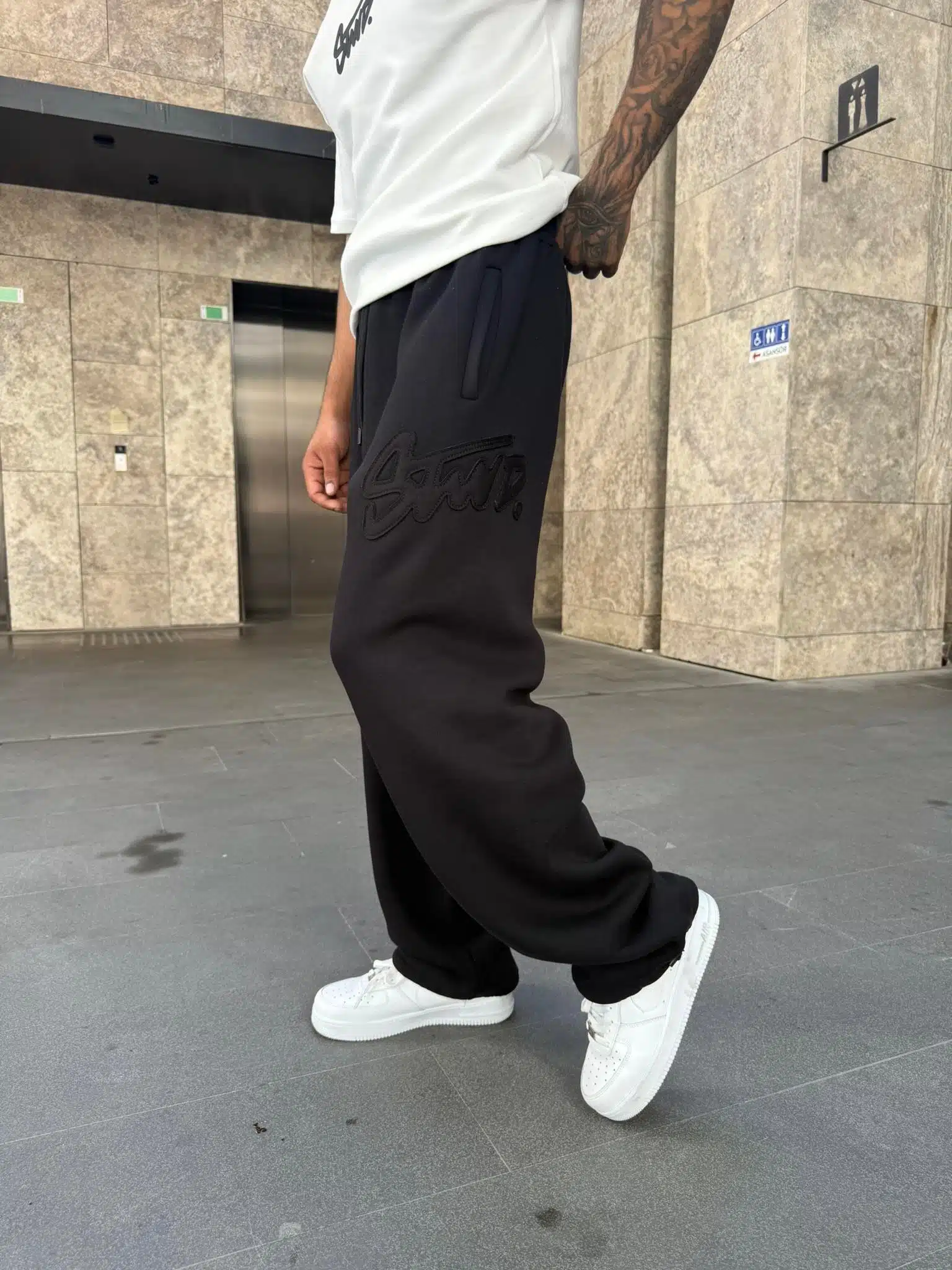 ‘SW’ Lazer İşleme Lastikli Stoper Paça Baggy Eşofman – Siyah